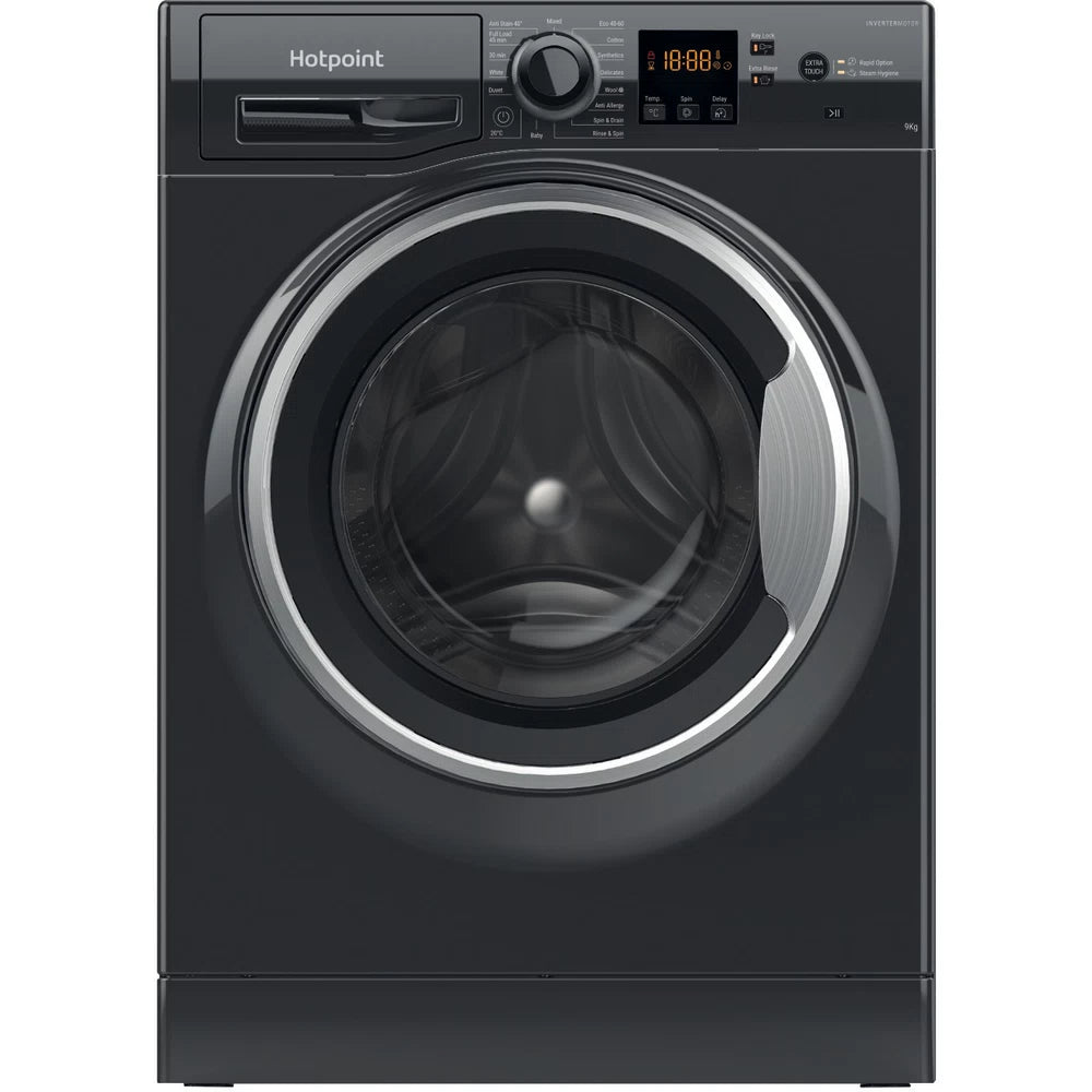 This Hotpoint freestanding front loading Washing Machine features: an extra-spacious, large 9,0kg capacity. B energy rating. A fast, resource-efficient 1400 revolutions per minute spin speed. Black color.