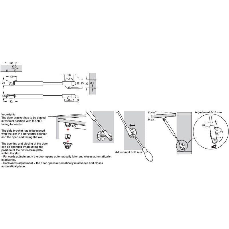 - To change the time in opening and closing of the door by adjusting the position of the piston base plate within the slot of the side bracket