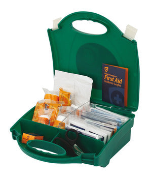 Consists of 1 x First aid guidance leaflet, 4 x 12x12 cm dressings, 1 x 18x18cm dressing, 2 x Triangular bandages, 6 x Safety pins, 2 x Eye pads with bandage no. 16, 40 x Assorted washproof plasters, 20 x Saline cleansing wipes, 1 x Microporous tape, 6 pairs x Large powder free nitrile gloves, 2 x Finger dressings, 1 x Revive aid mouth to mouth resuscitator, 1 x Emergency thermal blanket, 1 x Hydrogel burn dressing, 1 x Small tuff cut scissors, 1 x Conforming bandage