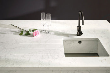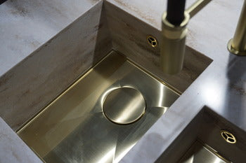 A unique concept which involves the combination of a solid surface, quartz or stone worktop with a purposely designed undermount sink, which when completed gives the appearance of a steel-bottomed, material-clad bowl.